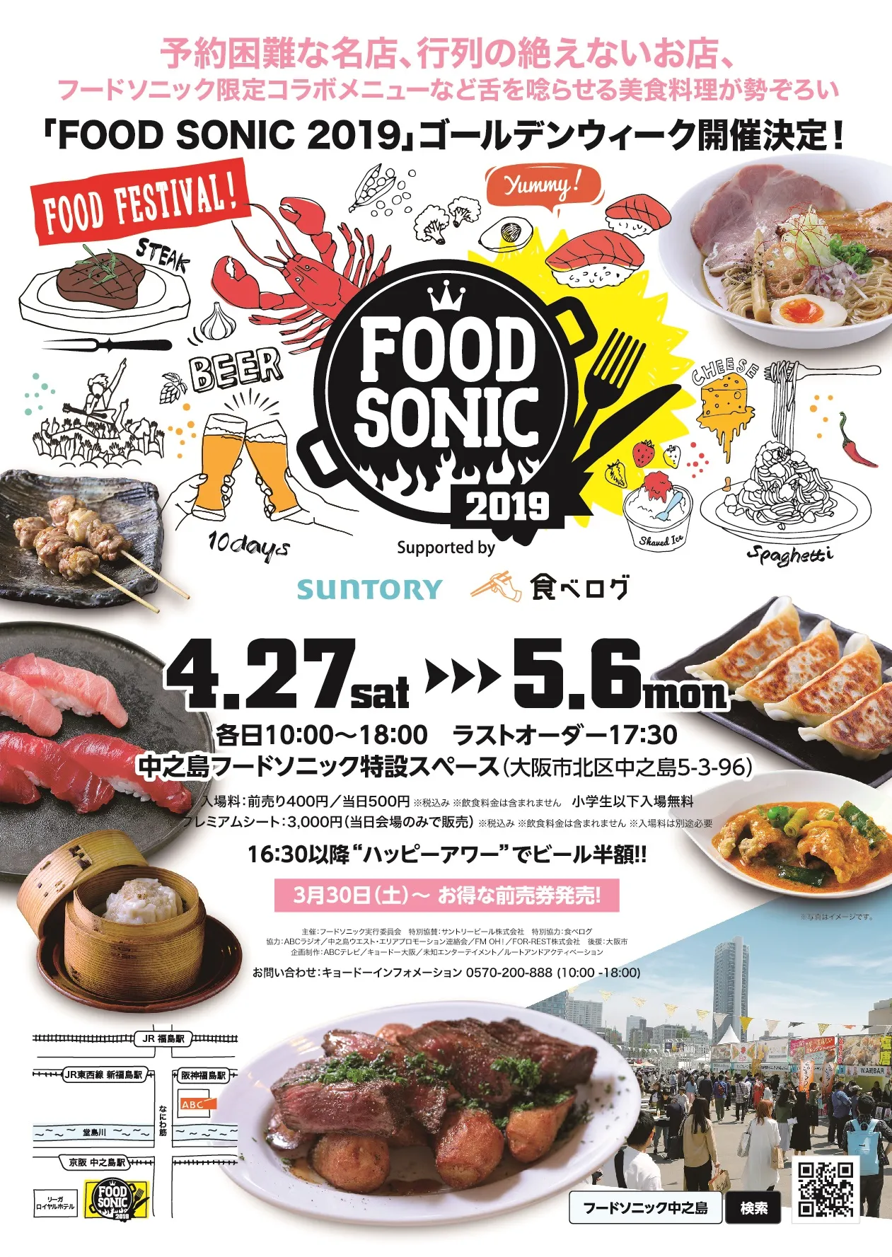 フードソニック実行委員会は、関西最大級のフードフェスティバル「FOODSONIC 2019 in 中之島」を過去最長となる10日間<2019年4月27日(土)~ 5月6日(月・振休)>、中之島フードソニック特設スペースにて開催いたします。