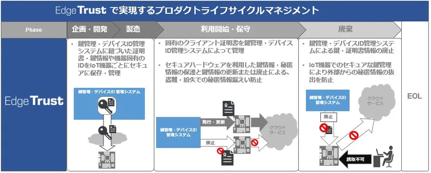 Edge Trustは、ユビキタスAIコーポレーションが提供しているセキュアIoT機器開発キットに、凸版印刷の鍵管理・デバイスID管理システムとファームウェア書き込みサービスを組み合わせることで、IoT機器のサプライチェーンを含むライフサイクルを通じた秘匿情報管理をワンストップで実現するものです。
