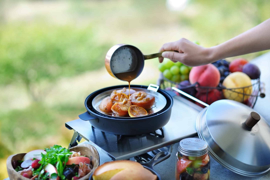 朝食を提供する場所は、眼前に富士山と河口湖の絶景を望む客室のテラスです。広々としたソファーが設えられたプライベート空間で食事を楽しめます。グランピングマスターのサポートのもと、スキレットやバーナーなどアウトドア器具を用いて、調理の仕上げを行います。ベーコンの香りをつけて香ばしく桃を焼き、フレッシュハーブを添えればメインディッシュ「甘酸っぱい桃のロースト」の完成。ベーコンと桃の果肉のジューシーな味わいを堪能できる一品です。食材の準備や味付けは事前に済ませているので、失敗なくアウトドア体験を楽しめます。