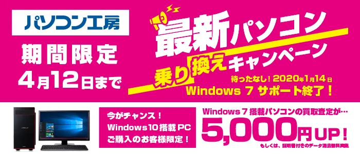 パソコン工房・グッドウィルを運営する株式会社ユニットコム(代表取締役:端田 泰三、本社:大阪市浪速区)は、全国のパソコン工房・グッドウィルの店舗、インターネット通販にて、2019年4月12日(金)までの期間限定で、Windows 7からWindows 10への乗り換えの際、Windows 7搭載パソコンの買取査定が5,000円増額、または、証明書付きのデータ消去サービスが無料となる下取りキャンペーン『最新パソコン乗り換えキャンペーン』を開催いたします。