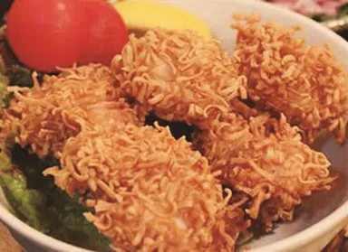外はカリカリッ、中は肉汁ジュワー。話題のチキンラーメンを唐揚げの衣に用いた大阪・池田市のご当地創作料理です。