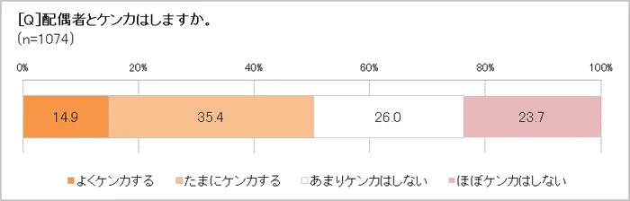 配偶者とのケンカについては、「よくケンカする」と「たまにケンカする」を合わせると、50.3%。ケンカになる原因としては、「生活態度・時間など」が61.2%とダントツでトップ。「いつもスマホゲームばかりしている」(30代・専業主婦)、「脱ぎっぱなし、やりっぱなしなどが多くて困る」(50代・パート)など、生活習慣がケンカのタネになることが多いようです。