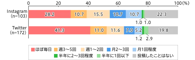 Instagramに毎日投稿する人は28.2%。Twitterに毎日投稿する人は41.3%。Twitterの投稿頻度の方が高い