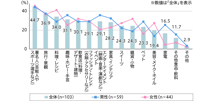 Instagramで見る情報は、男女とも「著名人」についてが多い。男性は家電についてもInstagramで情報接触をしている傾向がある