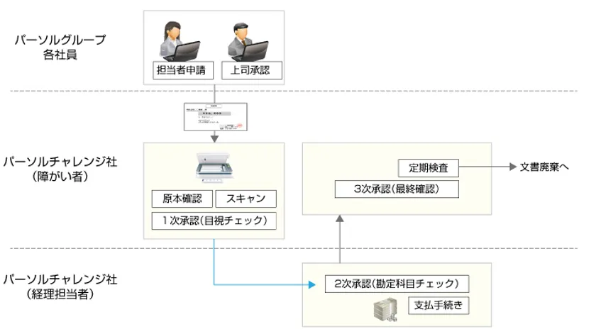 結果、従来7年間以上の保存が必要だった書類(年間約200箱)のペーパーレスを実現、またパーソルチャレンジ社では、東京・大阪で計10名の障がい者が、経費旅費の受付・承認業務(原本確認、スキャニングや最終確認、定期検査など)を実施しています。