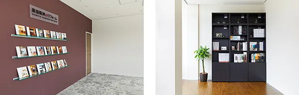 リフォームのイメージをより膨らませていただけるよう、フローリング調や石目調フロアタイル、タイルカーペットで床を貼り分けた雰囲気の異なるご相談スペースを設けております。また、当社リフォームの施工事例を展示し、内装サンプルやカタログを実際にご覧いただきながら、落ち着いた雰囲気の中でご相談いただけます。