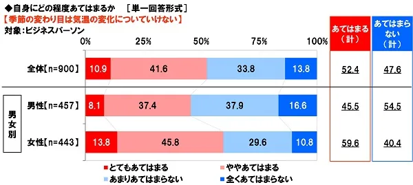 続いて、ビジネスパーソン(900名)に、季節の変わり目の生活や健康状態について聞きました。