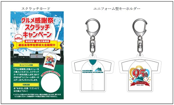 95周年記念グルメの発売に合わせてキャンペーンを実施いたします。対象メニューをご購入いただいた方に、1商品につき1枚スクラッチカードをお渡しし、当たりが出ればユニフォーム型キーホルダーをプレゼントいたします。なお、景品引換店舗は全ての「お弁当」店舗及びワゴンです。