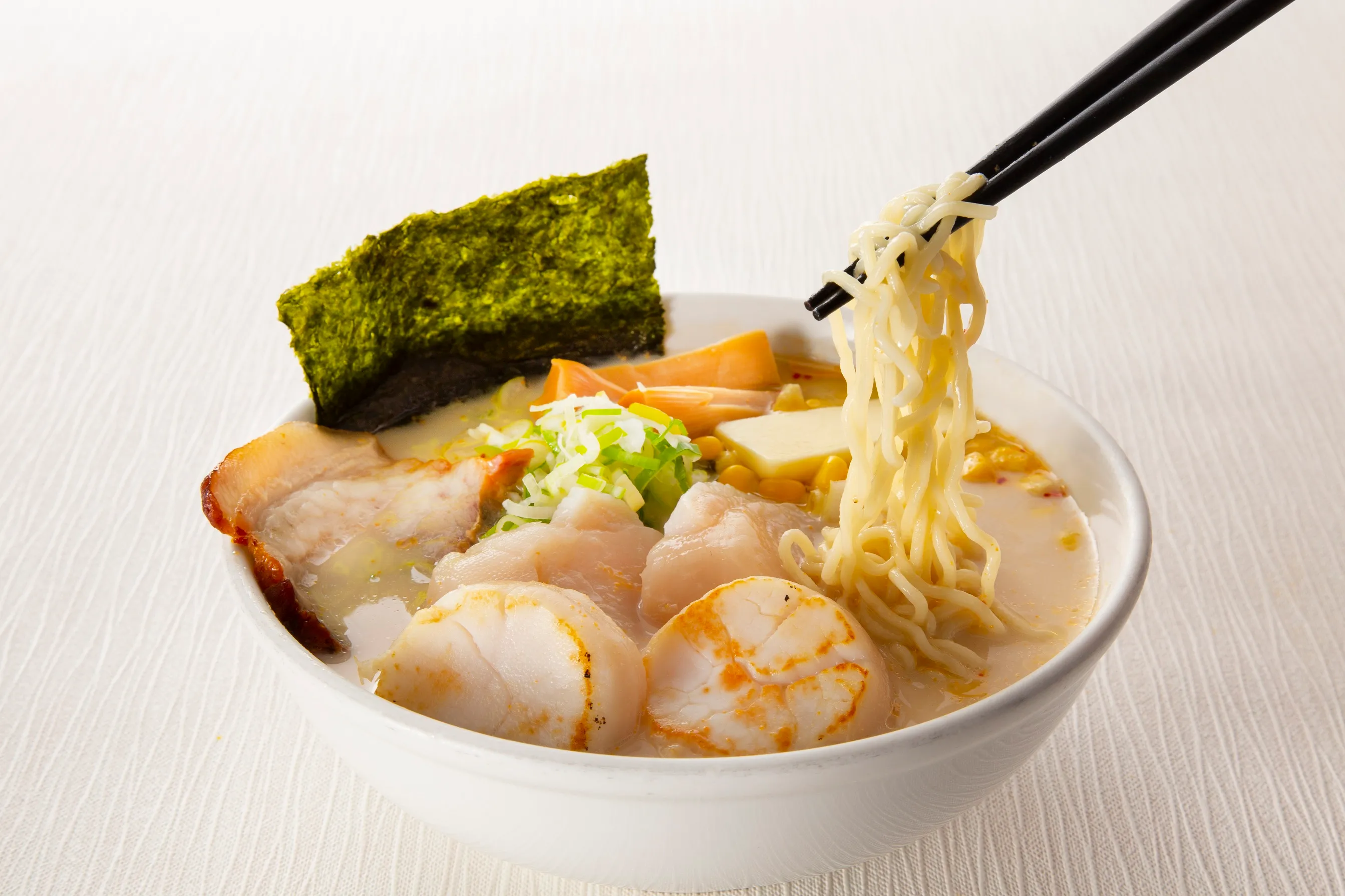 北海道産の肉厚で新鮮なホタテのソテーをのせました。濃厚で味わい豊かな味噌ベースのスープに、ホタテの香ばしさとバターの風味がよく合います。