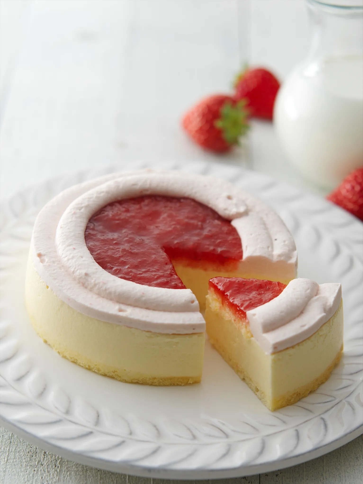 十勝産ジャージー牛乳のムースに、十勝音更(おとふけ)町(ちょう)で生産されているブランドいちご「銀龍苺」のシャンティーを加えた甘酸っぱいチーズケーキです。