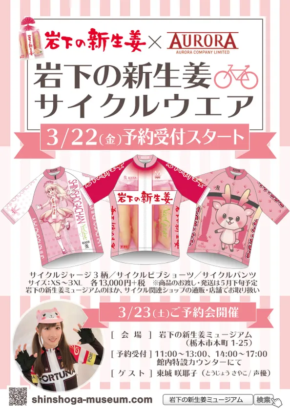岩下の新生姜ミュージアムでは、3月23日(土)に声優の東城咲耶子さんをゲストにお迎えし、『岩下の新生姜サイクルウエアご予約会』を開催いたします。