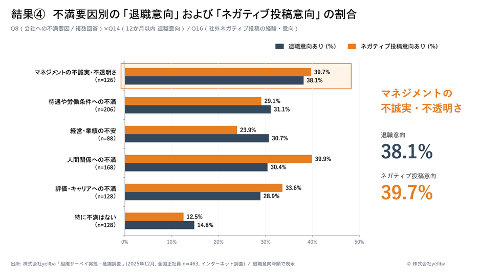 会社に対する不満要因として「マネジメントの不誠実・不透明さ」を挙げた層では、退職意向が38.1%、ネガティブ投稿意向が39.7%といずれも高い水準となりました 。これは給与や労働条件といった外的要因以上に、「自分たちの声がどう扱われるか」という姿勢やプロセスへの不信感が、具体的な離職や情報発信行動に強い影響を与えている可能性を示唆しています 。