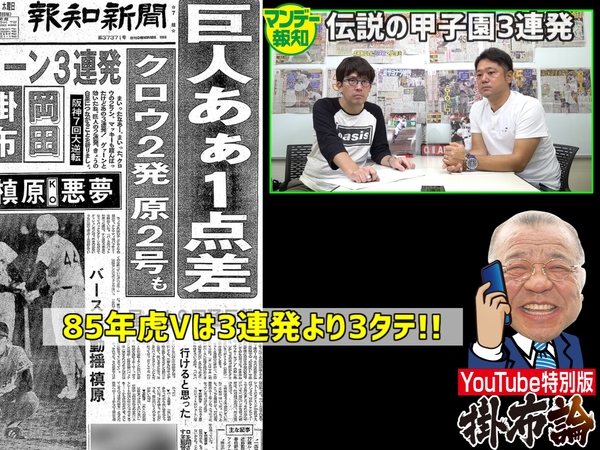 ジャイアンツが敵地での阪神との首位攻防3連戦に連敗し2位転落。再奪首を狙った3戦目も6点リードを追いつかれたどころか、あわやサヨナラ負けのピンチを何とか切り抜け、引き分けに終わりました。掛布さんは、スタンドの観客増で「甲子園の魔物」がよみがえったと指摘。3連敗なら巨人の逆転優勝は非常に厳しくなっていたと分析すると同時に、「私の用兵ミス」と自ら負け越しの責任を背負った原監督の姿勢を高評価しました。また「怖いのはヤクルト」と不気味な存在を挙げ、V争いの混戦を予想。だが、甲子園での3タテを回避したことで、巨人有利を繰り返し明言。お馴染みのMC加藤&水井両デスクを喜ばせました。