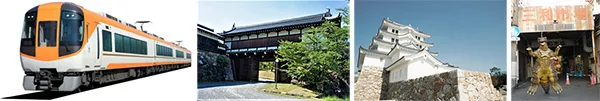 (画像左から)近鉄特急用車両22600系(イメージ)、郡山城跡 追手向櫓、尼崎城、アマの大怪獣「ガサキング」