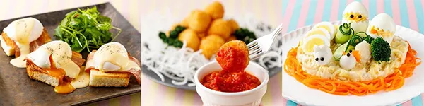 (左から)エッグベネディクト、ポテトとチーズのクロケット 巣ごもり仕立て、イースターエッグサラダ