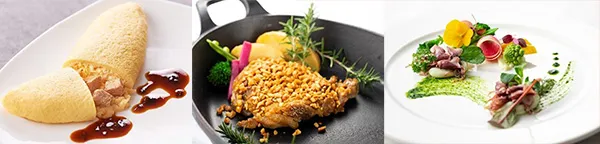 (左から)フォワグラ入りオムレツ トリュフソース、鶏モモ肉のナッツ焼き、ホタルイカのマリネと春野菜のサラダ仕立て
