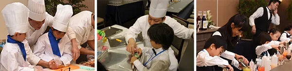 このイベントは今回で10回目を迎えるもので、宴会場に設置した職業体験ブースにて、パティシエや寿司職人の他、ウェイター、バーテンダーなどのホテルのお仕事やフラワーアレンジメント、カメラマンおよびホテル館内店舗での接客体験など全12種のお仕事をスタッフが丁寧にお教えいたします。仕事の難しさ、楽しさを学ぶと共に、家族皆様で楽しめるお料理をバイキングスタイルで提供いたします。