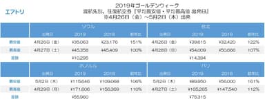 また、GW期間中(2019年4月26日~5月6日)における「海外旅行予約件数」の、前年同期比(2018年4月27日~5月6日)は219%となりました。