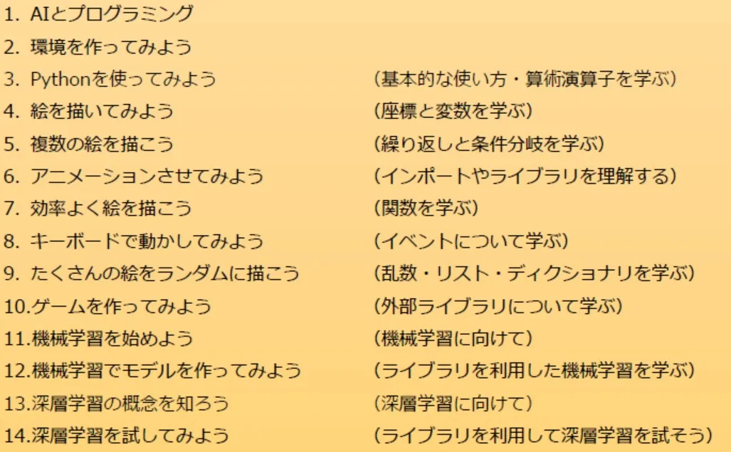 AIを用いて絵を描く・ゲームを作るなどお子様の好奇心を刺激しながら、最終的には機械学習や深層学習などAI技術の中核部分も学ぶカリキュラムで構成されています。