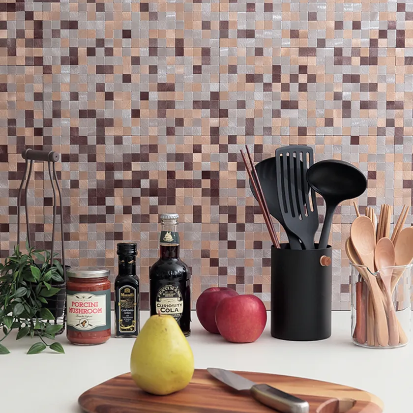 この「メタルタイル」は、お部屋の壁や家具、キッチンなどいろいろなところに手軽に貼ってデコレーションすることができます。豊富な色柄展開から選ぶことができ、シールタイプで設置も簡単。傷や汚れが気になる部分に貼ったり、お部屋のイメージを変えたり、手軽にできる簡単DIYをお試しいただけます。