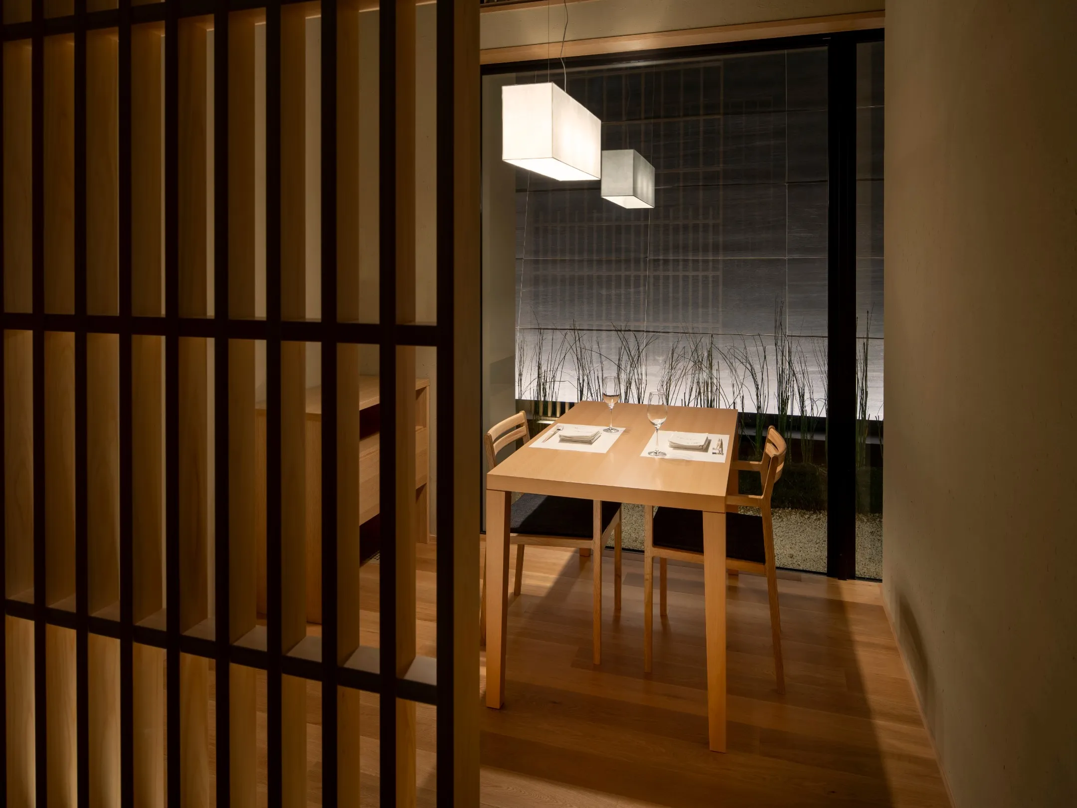 窓から見える水庭では、散りばめられた蓄光石の光のアートが心身を包み込み
