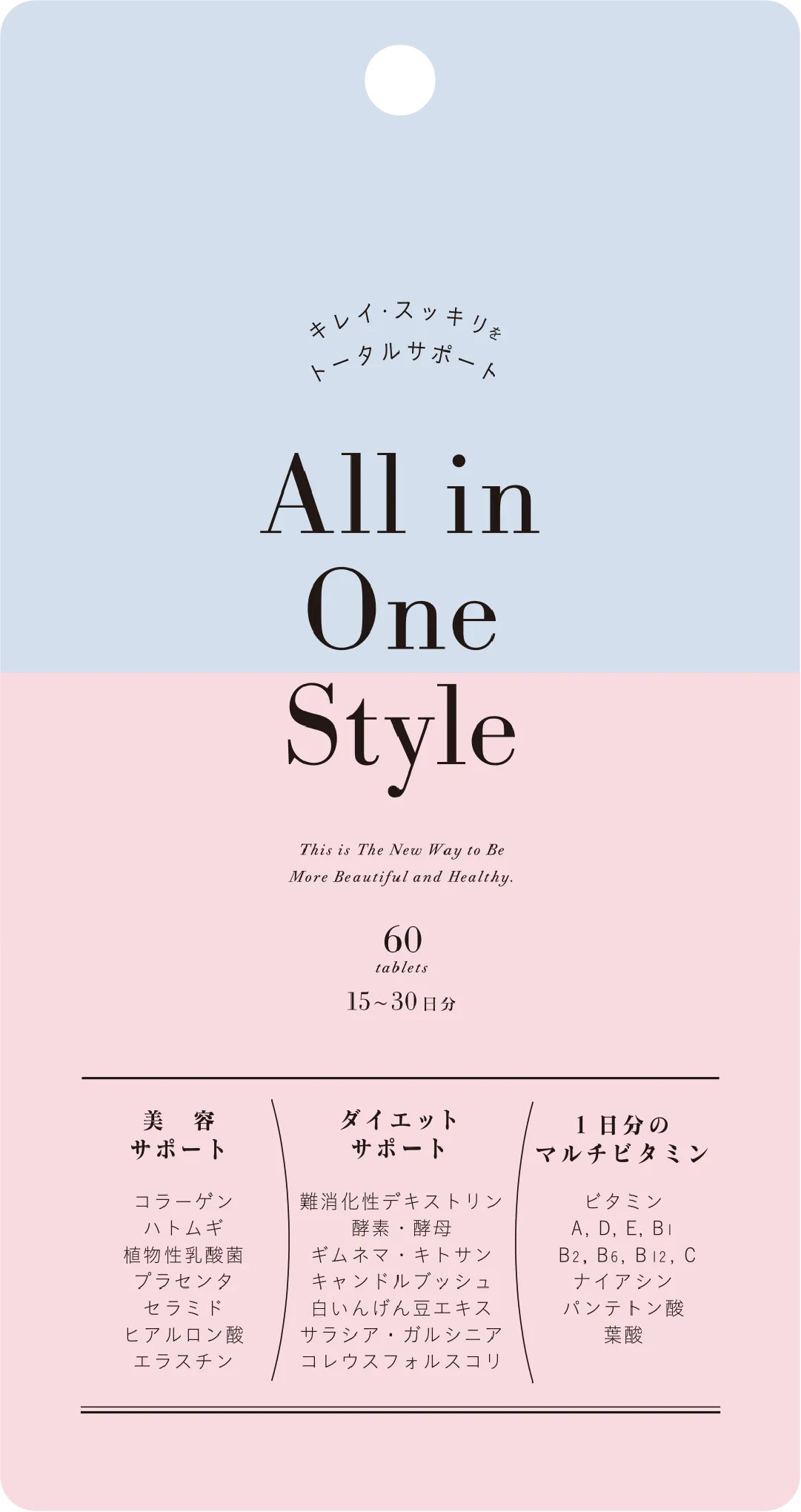「All in One Style」は1つで5役を果たすサプリメントです。コラーゲンやはと麦を含む7種類の美容サポート成分をはじめ、スッキリ・運動するカラダ・カロリーバランスのダイエットサポート成分10種類と1日分のマルチビタミンを配合。食べたいあなたのキレイ・スッキリをサポートします。