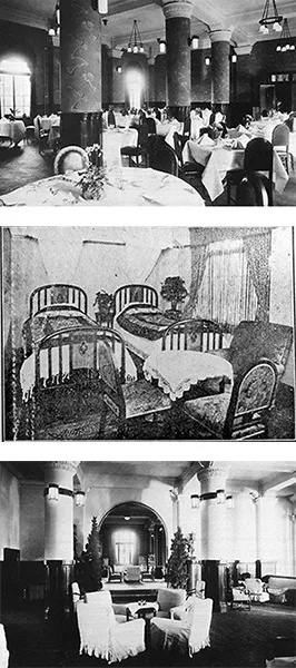 (画像上から)開業当時のレストラン、開業当時の客室、開業当時のホテルロビー