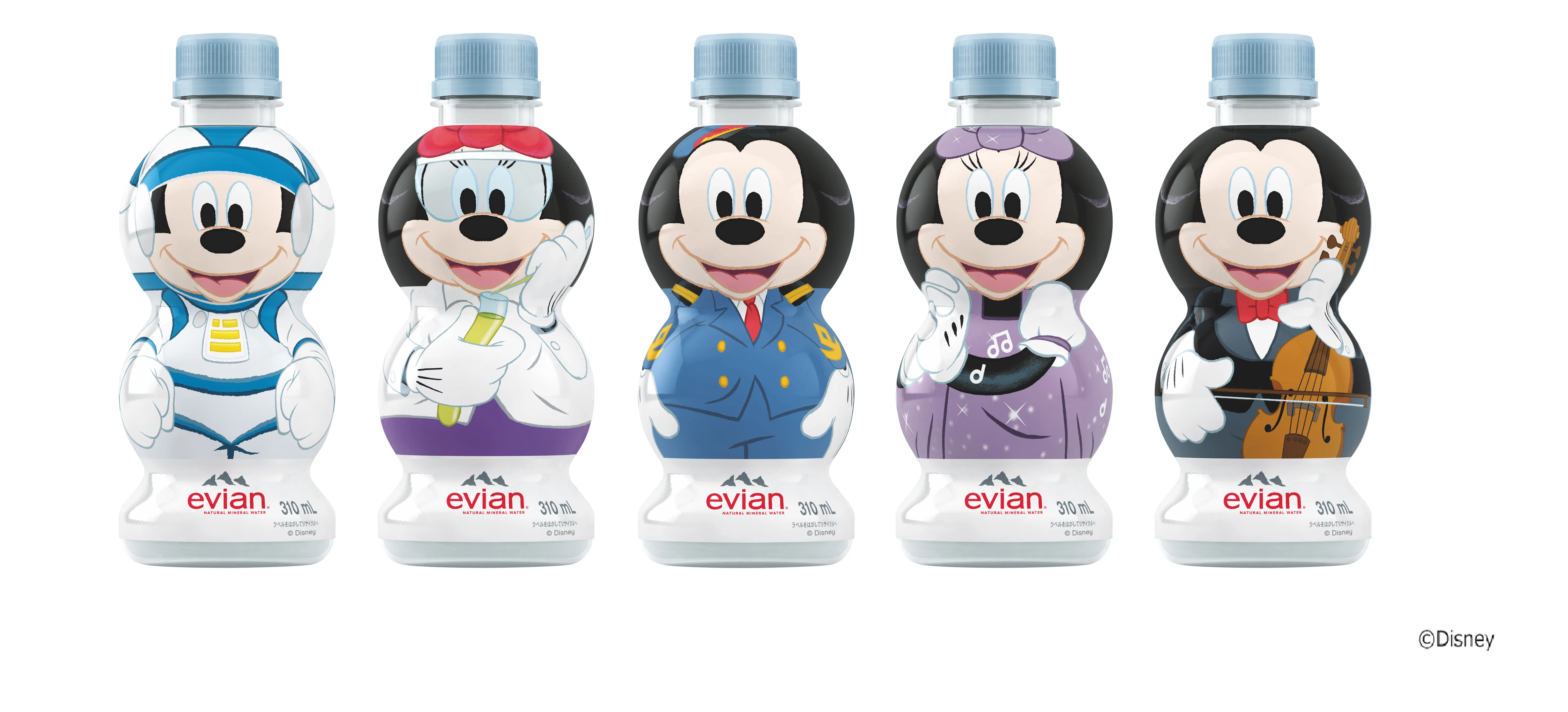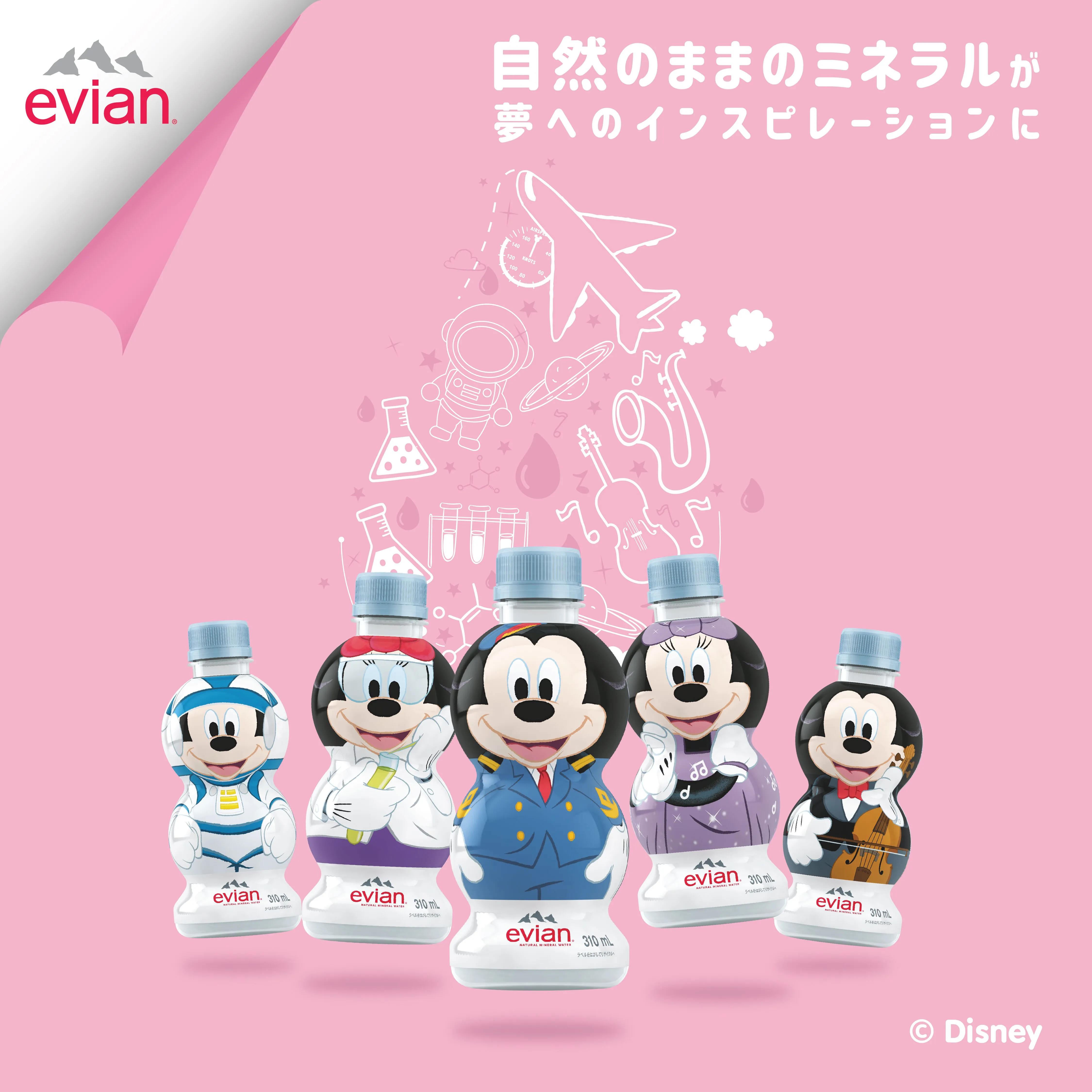 「エビアン(R) キャラクターボトル ミッキーシリーズ」第3弾のテーマは、『自然のままのミネラルが夢へのインスピレーションに』。みんなに愛されるミッキーマウスが、子どもたちの夢見る5つの職業、宇宙飛行士、科学者、パイロット、歌手、ミュージシャンになり、ボトルのデザインで登場。夢を追う子どもたちの、楽しく、バランスの取れた、より健康的な水分補給を応援します。また、5種類全部集める楽しみを提供するとともに、健康的な水分補給の習慣に繋がることを目指します。