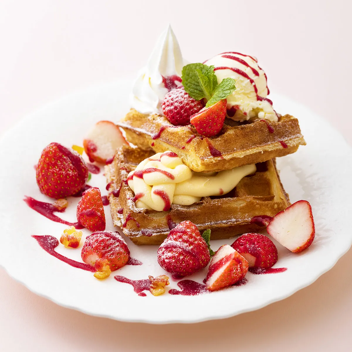 名物の焼きたてワッフルに、旬のいちごやカスタードクリーム、バニラアイスをのせ、甘酸っぱいフランボワーズとオレンジのソースでデコレーション。