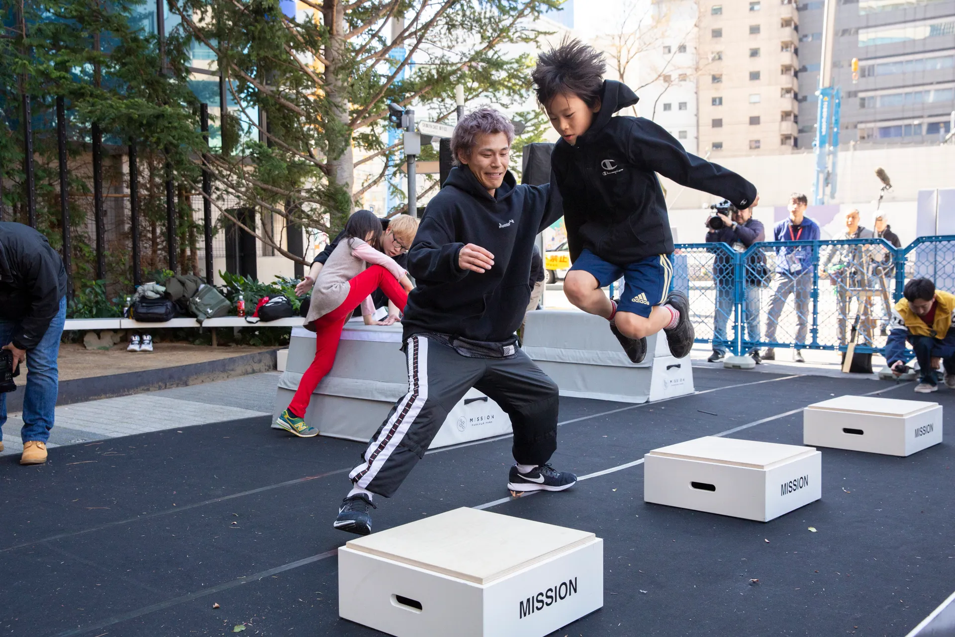 また、アーバンスポーツの楽しさを体験してもらうため『FISE WORLD SERIES HIROSHIMA 2019』の競技でもあり、身体一つで障害物を乗り越えて目的地へ移動する競技「パルクール」の体験会が行われました。会場は途中から青空となり、東京の都心部で、小学生などがアーバンスポーツを楽しみました。