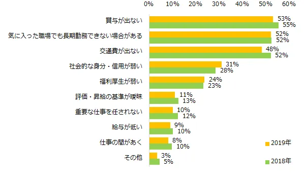 「賞与がない」(2019年:53%、2018年:55%)、「交通費が出ない」(同:48%、52%)は昨年より減少。2020年4月1日から施行される働き方改革関連法の改正により、「同一労働同一賃金」が導入されることで、さらに解消されるかもしれません。