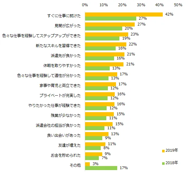 派遣で良かったことを伺うと、「すぐに仕事に就けた」(42%)が最多でした。昨年と比べると、大きくポイントが伸びています。仕事探しから就業までのスピード感も、派遣の魅力のようです。