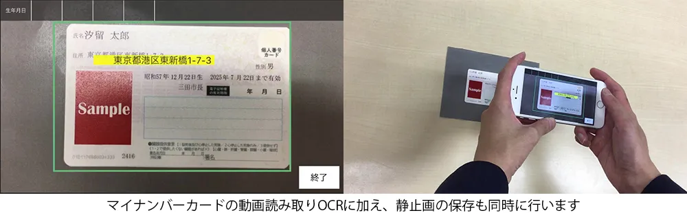 本ソリューションは、対象の本人確認書類・帳票をかざすようにしてキーワードを抽出し、その近傍値をOCR(光学式文字認識)することで高精度なテキストデータ化を実現します。さらに、マイナンバーカードや通知カード、運転免許証(予定)は、撮影した動画の一部を静止画として切り出すことができ(*1)、手続き時に提出する本人確認書類のコピーの代わりとして利用可能です。