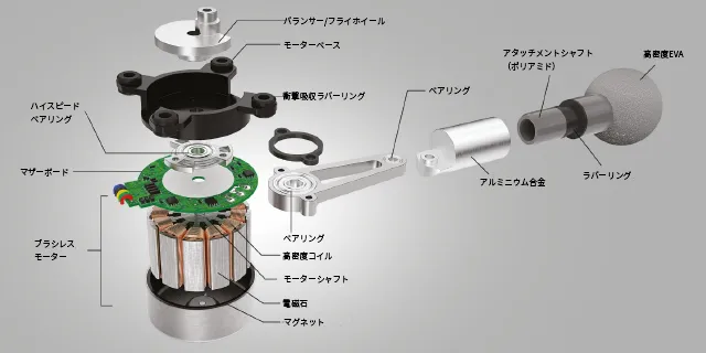カーエンジニアリングの応用から独自に設計され、モーターの回転運動をピストンの前後運動に転換します。モーターの心臓部に採用された日本製の高速ブラシレスモーターから生み出される滑らかで強力なピストン運動は、筋肉の奥深くに多数の衝撃を与えることで、リフレッシュをサポートします。