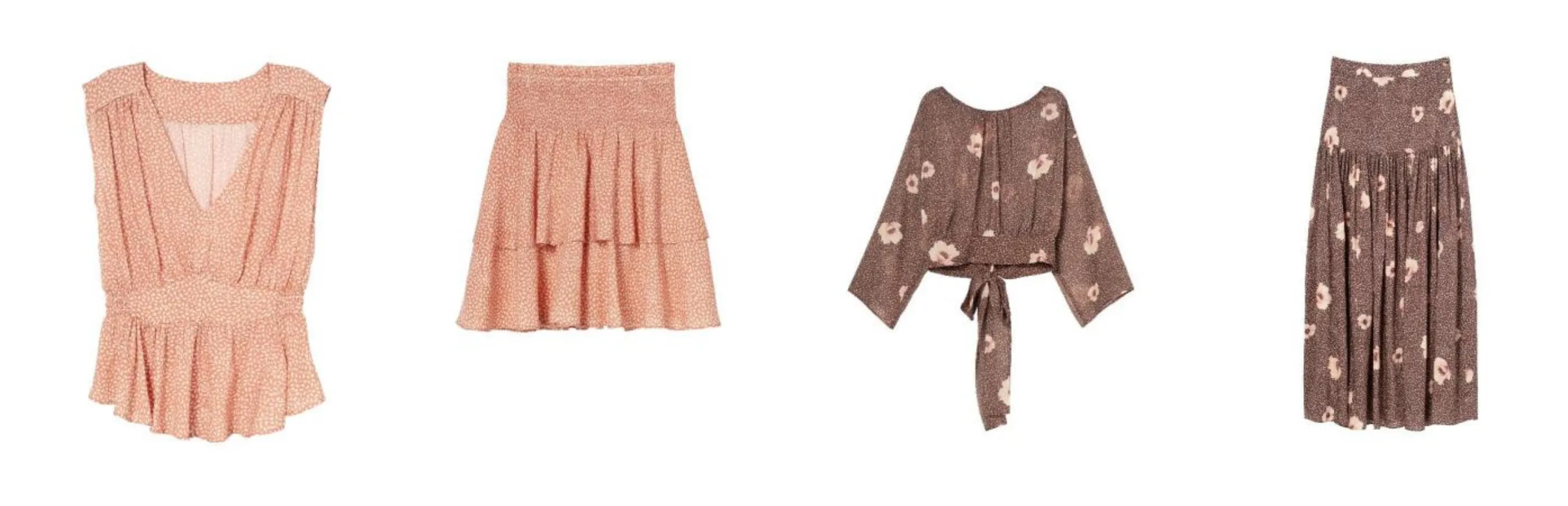 (左から)トップス ¥1,799(税込)、スカート ¥2,499(税込)、トップス ¥2,499(税込)、スカート ¥2,499(税込)