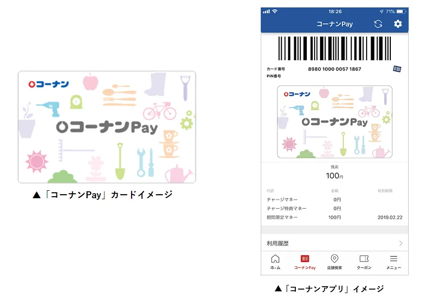 「コーナンPay」は全国346店舗(2019年2月28日時点)の「ホームセンターコーナン」「ホームストック」「コーナンPRO」でご利用いただけるプリペイド式電子マネーです。通常のカードの他、スマホアプリ版も提供しており、アプリ上でのバーコード決済やチャージによるキャッシュレス決済を実現するとともに、お客様属性に合わせたクーポン配信などに対応することで、利便性を向上し来店を促します。また、アプリではホームセンターコーナン・ホームストック・コーナンPRO全店で蓄積・利用ができる楽天ポイントの蓄積・利用も可能になります。