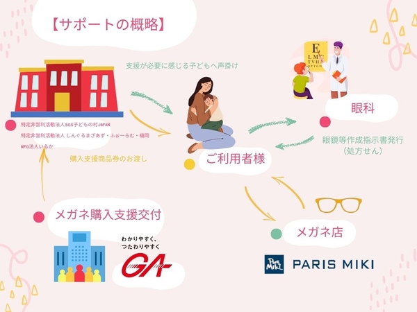 SOS子どもの村JAPAN、しんぐるまざあず・ふぉーらむ・福岡、いるか、が「見えにくさ」を感じている子どもたちへ声掛けをし、支援者と相談のうえ決定。眼科医の眼鏡等作成指示書(処方せん)を取得後、近隣のパリミキでメガネを購入。メガネの購入代金(商品券)はゼネラルアサヒとパリミキから支援されます。