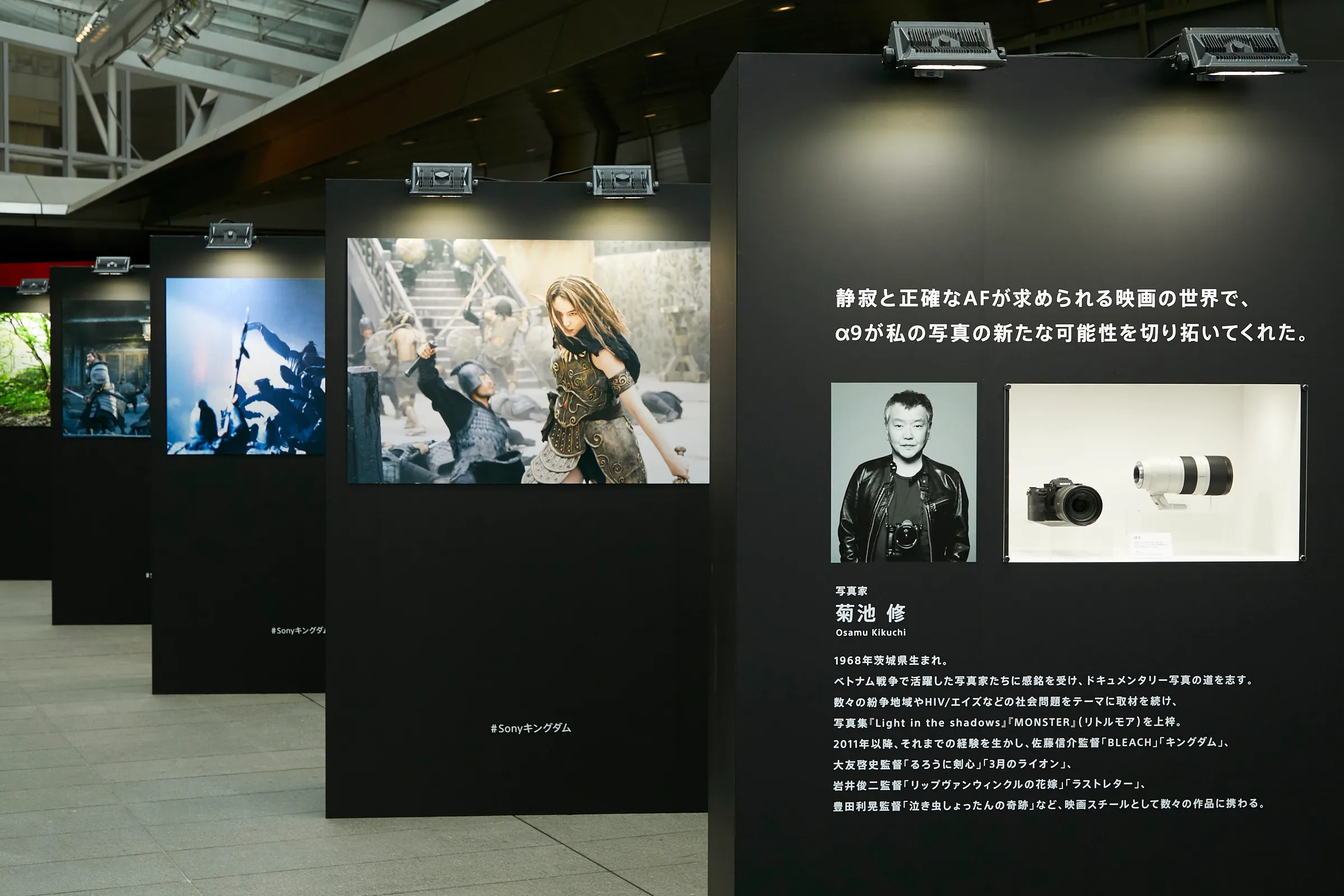 本写真展では、「キングダム」の実写化を実現したクリエイターたちが真摯に映画づくりに取り組む姿や、彼らが生み出した名シーンの数々を、写真家の菊池修氏が、映画撮影の現場に密着しフルサイズミラーレス一眼カメラ『α9』で撮影。その写真を、共に作品を作り上げてきたソニーが「Beyond the SCENE―クラフトマンシップで挑む、もう一つのキングダム」をテーマに紹介しました。