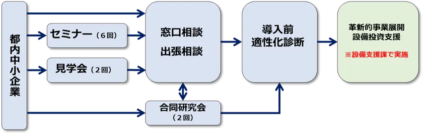 当公社では、都内中小企業のロボット導入・活用を促進するため、(1)セミナーや見学会の開催を通じた情報及びノウハウの提供、(2)導入を検討している企業に対する窓口相談・出張相談、合同研究会(システムインテグレーターとの情報交換)、個別診断の実施、(3)導入・活用により生産性の向上が期待できる企業への設備助成の支援を行います。
