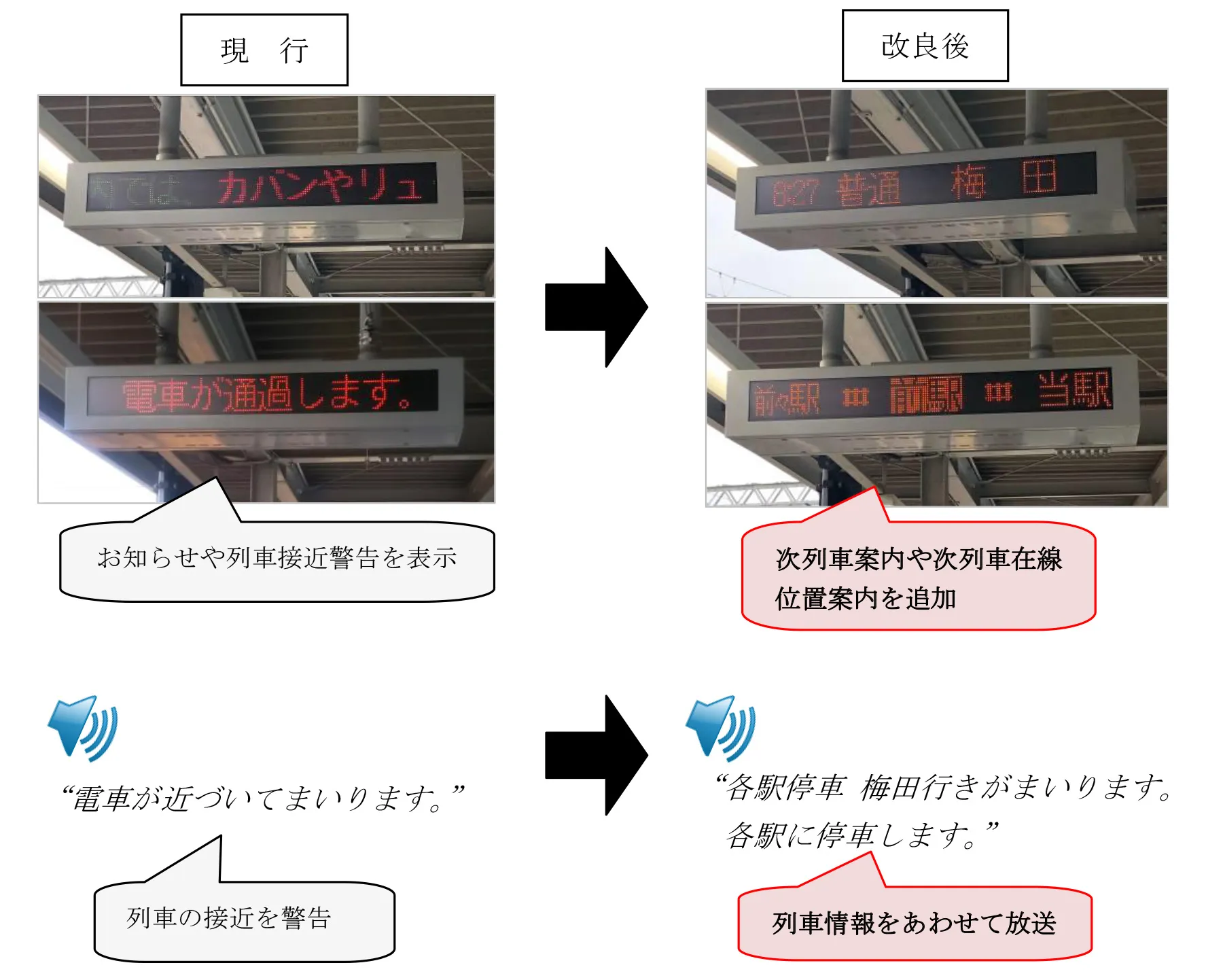 これまで、駅ホームにおいて列車案内(先発列車の発車予定時刻・種別・行先のご案内)を実施していなかった駅において、列車接近表示器と自動放送装置を用いた列車案内を導入しました。