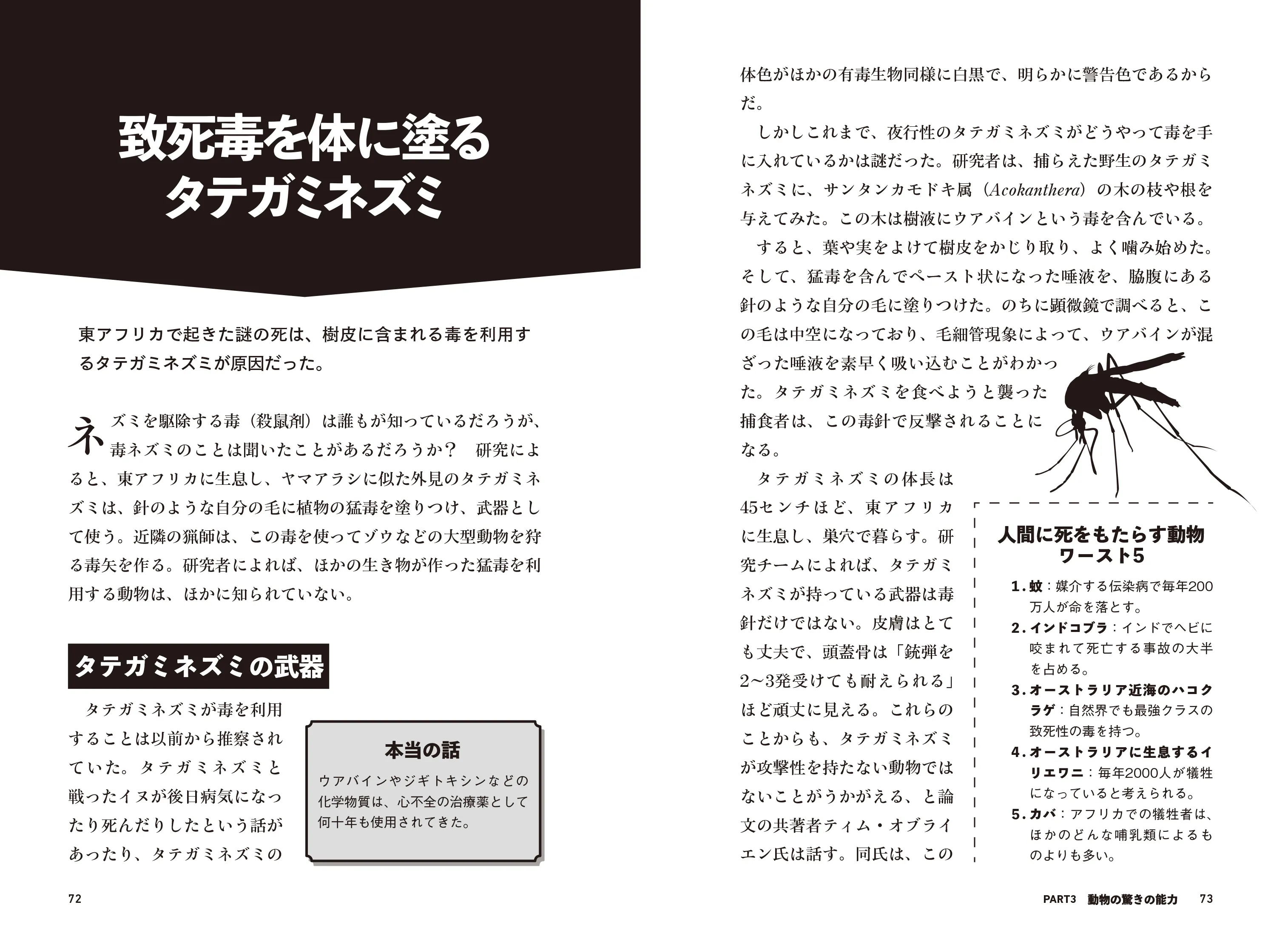 ウイルスに操られる昆虫、吸血鬼の頭蓋骨、自分の毛皮に毒を塗るネズミ、くさすぎて絶滅しかけている鳥など、時間を忘れて読みふけってしまう不思議で奇妙な、私たちの興味をかきたてる本当にあった出来事が詰まっています。本書を編集したナショナルジオグラフィックニュースの初代編集長デビッド・ブラウンは「真実は作り話以上に驚異に満ちている。私たちが生きているのは、真の発見の時代であり、この世界が人間の想像で作り出すどんなものよりもすばらしく、謎に満ちているということを思い知らされます。」と書いています。毎日、世界で数億人の人々が心待ちにしているナショジオニュースをまとめた初の書籍です。