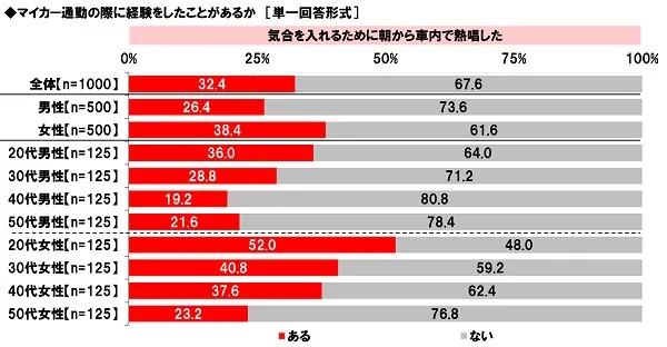 また、全回答者(1,000名)に、【気合を入れるために朝から車内で熱唱した】ことがあるか聞いたところ、経験率は32.4%となりました。マイカー通勤者の3人に1人は、気合を入れるために車内で熱唱したことがあるようです。