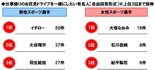 ■仕事帰りのお花見ドライブを一緒にしたい男性スポーツ選手 1位「イチローさん」 2位「大谷翔平さん」