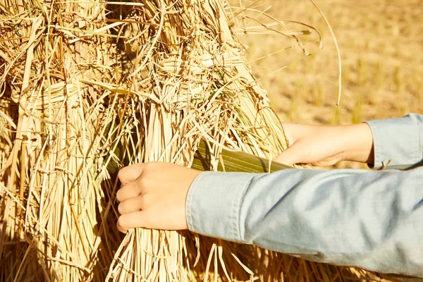 施設に隣接する田んぼで育った稲穂を収穫します。稲穂は「稲刈り鎌」を使用し、1株ずつ手刈りします。手刈りした稲は、10株程度をひとまとめにして、藁を使って束ねます。
