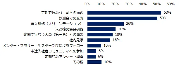 中途入社者の定着率向上のために行なっている企業の取り組みトップ2は「定期で行なう上司との面談」(53%)、「歓迎会での交流」(50%)でした。入社者とのコミュニケーションを増やすことによって、定着率向上を図る企業が多いようです。