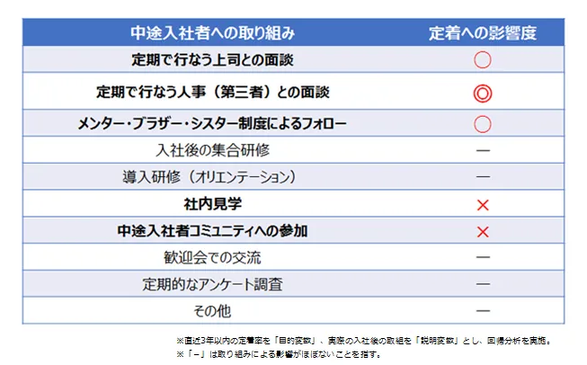 直近3年間で入社した中途入社者の定着率と、企業の取り組みから、「取り組みによる定着率の寄与度」を調査しました。実際に行なわれている取り組みの中で、定着率に好影響だったのは「定期で行なう人事との面談」。次いで「定期で行なう上司との面談」でした。「中途入社者コミュニティへの参加」、「社内見学」はマイナスの影響に繋がるようです。