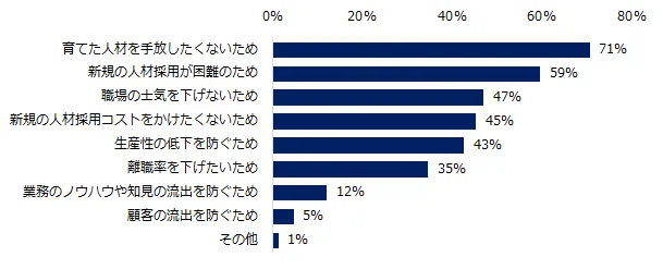今後の社員の定着率向上に向けた対応について伺うと、62%が「積極的に取り組む」と回答しました。理由を伺うと、トップは「育てた人材を手放したくないため」(71%)、次いで「新規の人材採用が困難のため」(59%)が続きます。「社員の定着」に関しての悩みもご紹介します。