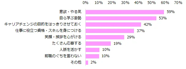 キャリアチェンジの経験の有無を伺うと、「キャリアチェンジしたことがある」と回答した方は54%でした。キャリアチェンジを成功させる秘訣を伺うと、第1位は「意欲・やる気」(59%)、第2位は「自ら学ぶ姿勢」(53%)、第3位は「キャリアチェンジの目的をはっきりさせておく」(42%)でした。