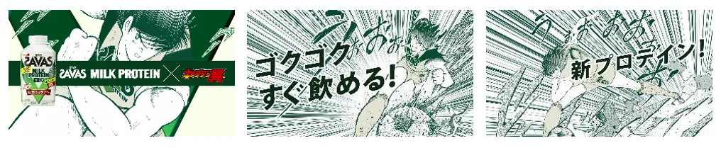本CMでは、大空翼の「オーバーヘッドシュート」、日向小次郎の「雷獣シュート」と、それぞれの必殺技が炸裂します。さらに、期間限定で「(ザバス)MILK PROTEIN脂肪0」シリーズの対象商品を購入すると、『キャプテン翼』デザインの絆創膏がもらえるキャンペーンも開催します。キャラクターがデザインされている、ファン必見のノベルティです。