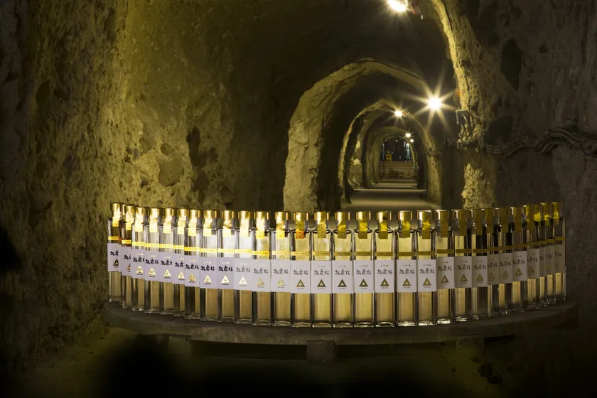 年間平均10℃の過熱にならない温度帯を維持しながら、季節による±5℃の温度変化のアクセントがプラス要素として熟成をすすめ、良酒へと導きます。世界の優れたワインカーヴの条件と類似する恵まれた温度環境、そして光の入らない恵まれた自然環境にて独自の味わいをつくりあげています。